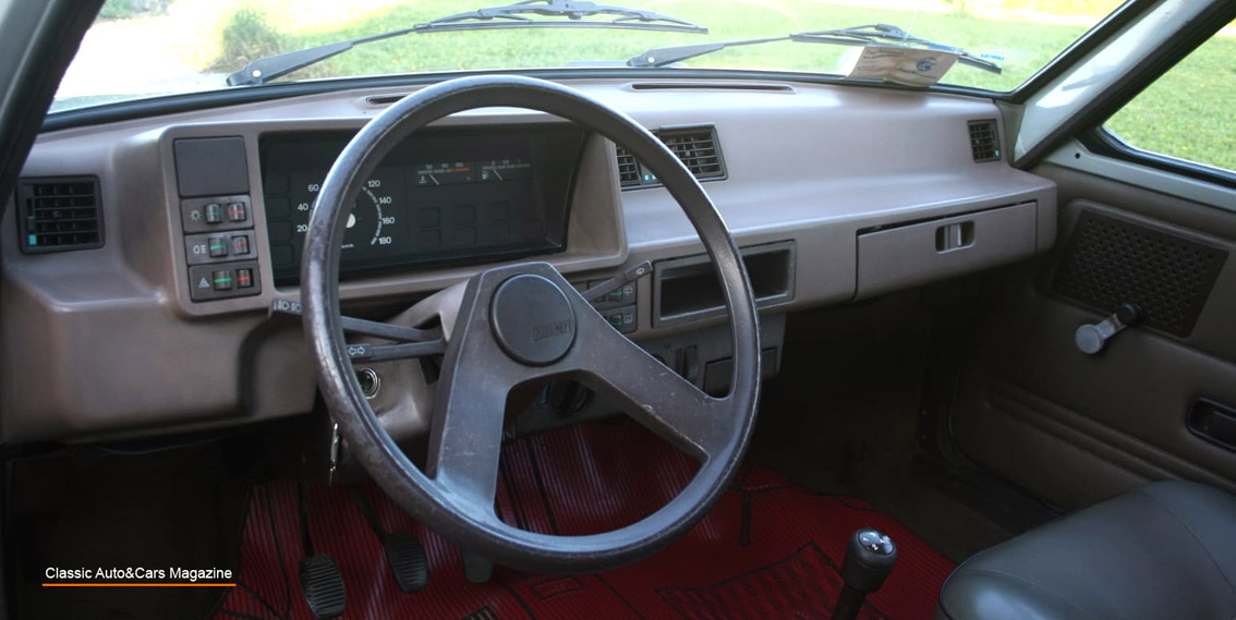 Internamente, invece, la differenza tra i due allestimenti è molto più marcata, la L ha un interno ridotto all’osso, tanto da sembrare più grande. Il pavimento è ricoperto da un tappeto in gomma, i sedili di serie non sono reclinabili e sono disponibili in un poco resistente panno o in una economica fintapelle traforata, le maniglie interne delle portiere sono più piccole rispetto all’allestimento superiore. La strumentazione è anch’essa minimalista, è presente il solo tachimetro con contachilometri totale e l’indicatore del livello carburante, con 10 spie a fare da corollario. Disponibili solo come optional a pagamento anche le cinture di sicurezza, i poggiatesta e il tergilunotto.