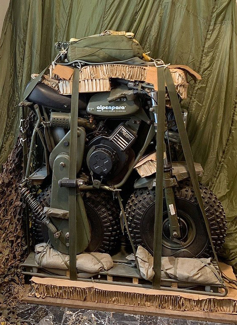 Motociclo polivalente paracadutabile in opportuna configurazione di lancio, è pronto all’uso in soli due minuti dal momento del contatto con il suolo, trasportando, su qualsiasi terreno, uomini e materiali. L’avviamento è a strappo, la quota massima per il suo impiego è di oltre tremila metri sopra il livello del mare.